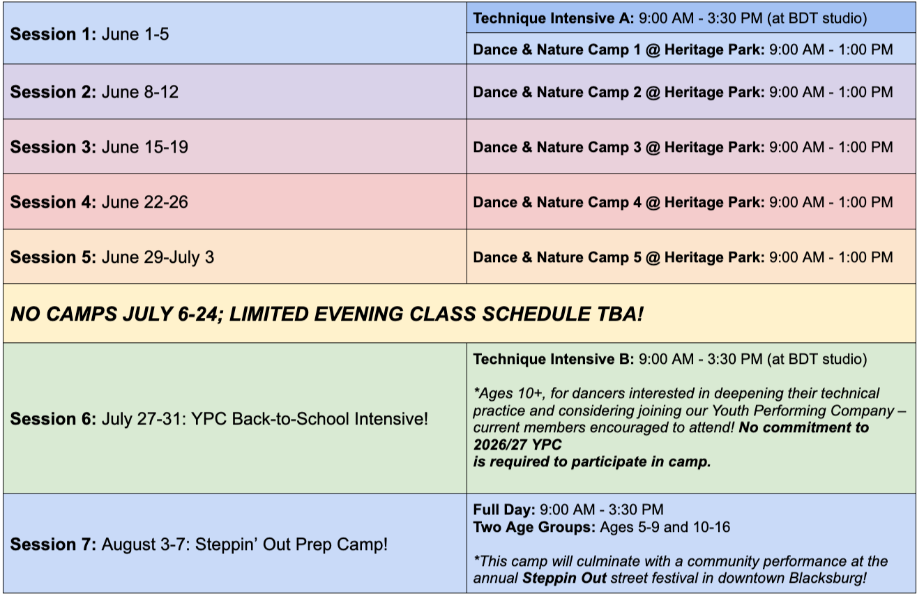 2. More dance-intensive camps will be held at Blacksburg Dance Theater (1711 N. Main St.) with occasional field trips.