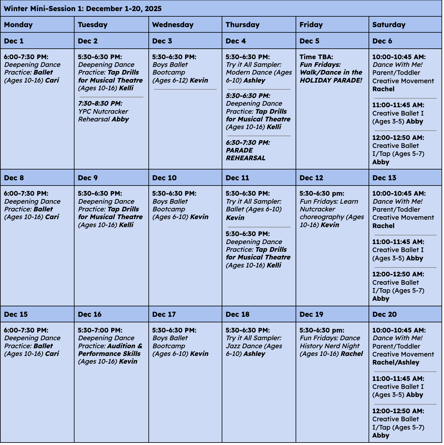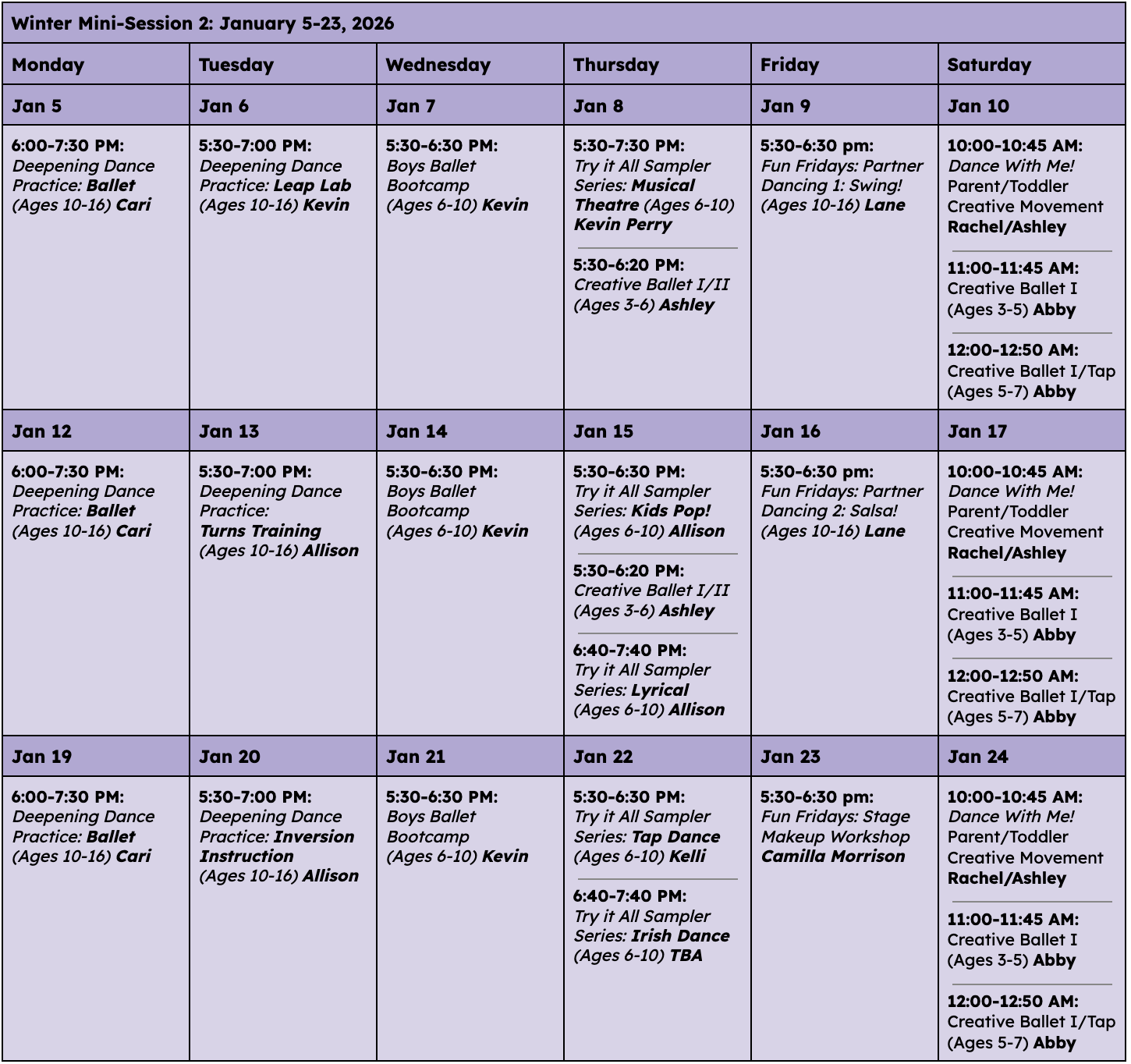 We’re excited to announce that registration is now open for our 2025/2026 Winter Mini-Sessions! These short, engaging class series are a wonderful way for dancers to stay active, explore new styles, or continue progressing between our main semesters.
